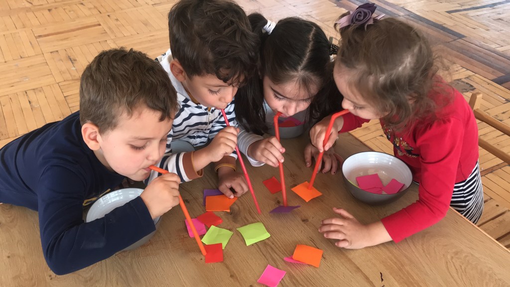 Այսօր արևմուտքի 5 տարեկանների հետ միասին խաղացինք շնչառական-խաղ վարժություն։ Նախապես գունավոր թղթերը կտրատեցինք և ձողիկի օգնությամբ սկսեցինք թուղթը տեղափոխել ափսեի մեջ։ Խաղի նպատակն է՝ ուշադրության կենտրոնացում, արագ կողմնորոշվելու ունակություն, գունաճանաչություն և համագործակցության հմտություն։