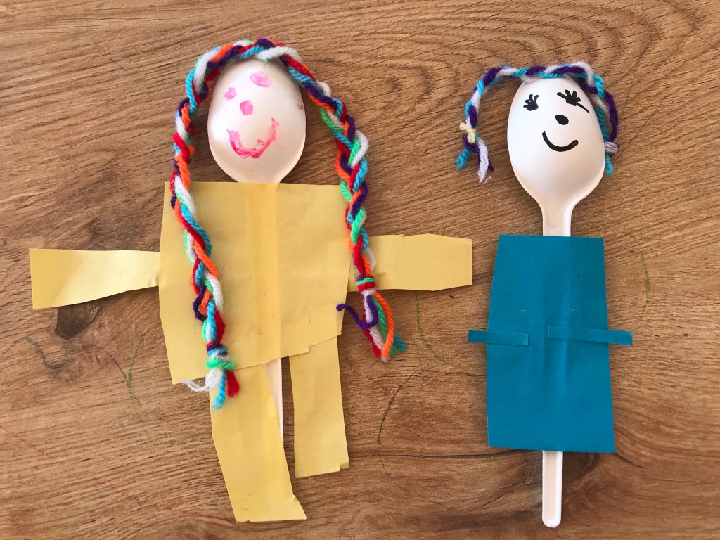 Այսօր սաների հետ միասին կատարեցինք տեխնոլոգիական աշխատանք։ Գունավոր թղթերից երկրաչափական մարմիններ կտրատեցինք, թելերից էլ՝ մազեր, իսկ այ գդալն էլ դարձավ մարդուկի մարմինը։ Արդյունքում ստացանք գդալե մարդուկներ։